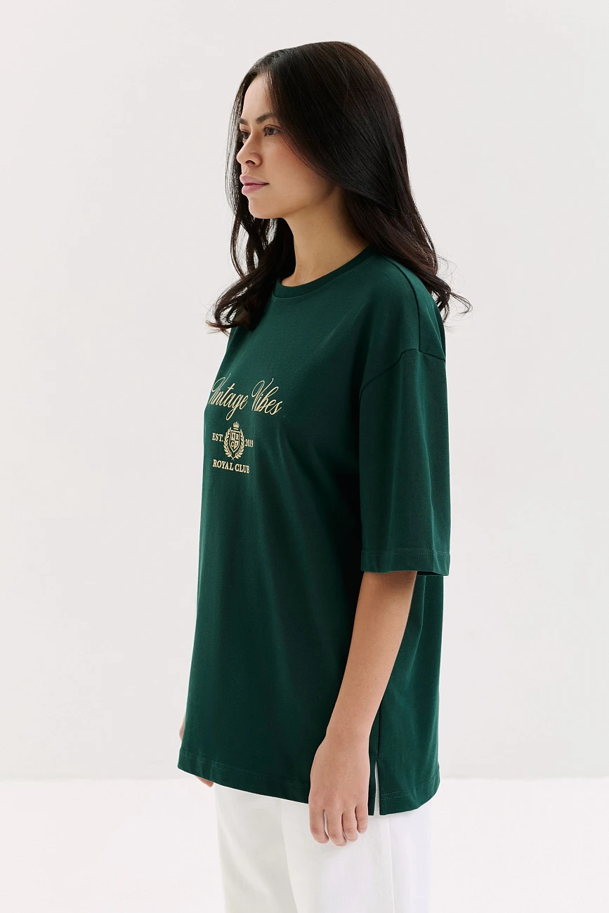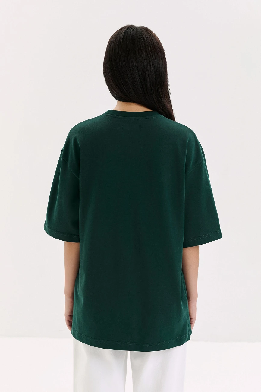 Плотная футболка свободного кроя. Выполнена из материала, который хорошо держит форму и устойчив к стиркам. Спущенная линия плеча и разрезы по бокам делают образ лаконичным и комфортным. На спине — фирменная нашивка с гербом бренда, что добавляет акцента в минималистичный дизайн.