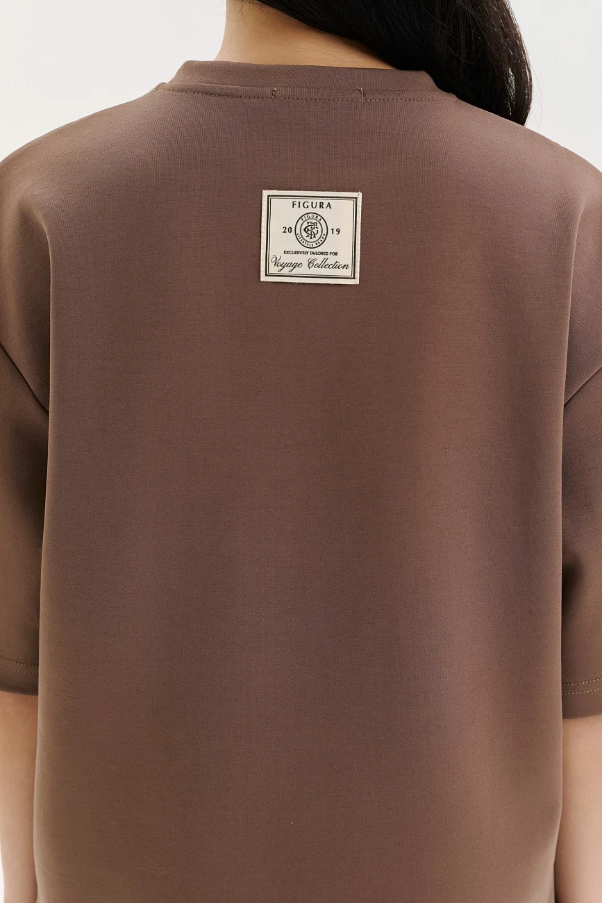 Плотная футболка свободного кроя. Выполнена из материала, который хорошо держит форму и устойчив к стиркам. Спущенная линия плеча и разрезы по бокам делают образ лаконичным и комфортным. На спине — фирменная нашивка с гербом бренда, что добавляет акцента в минималистичный дизайн.